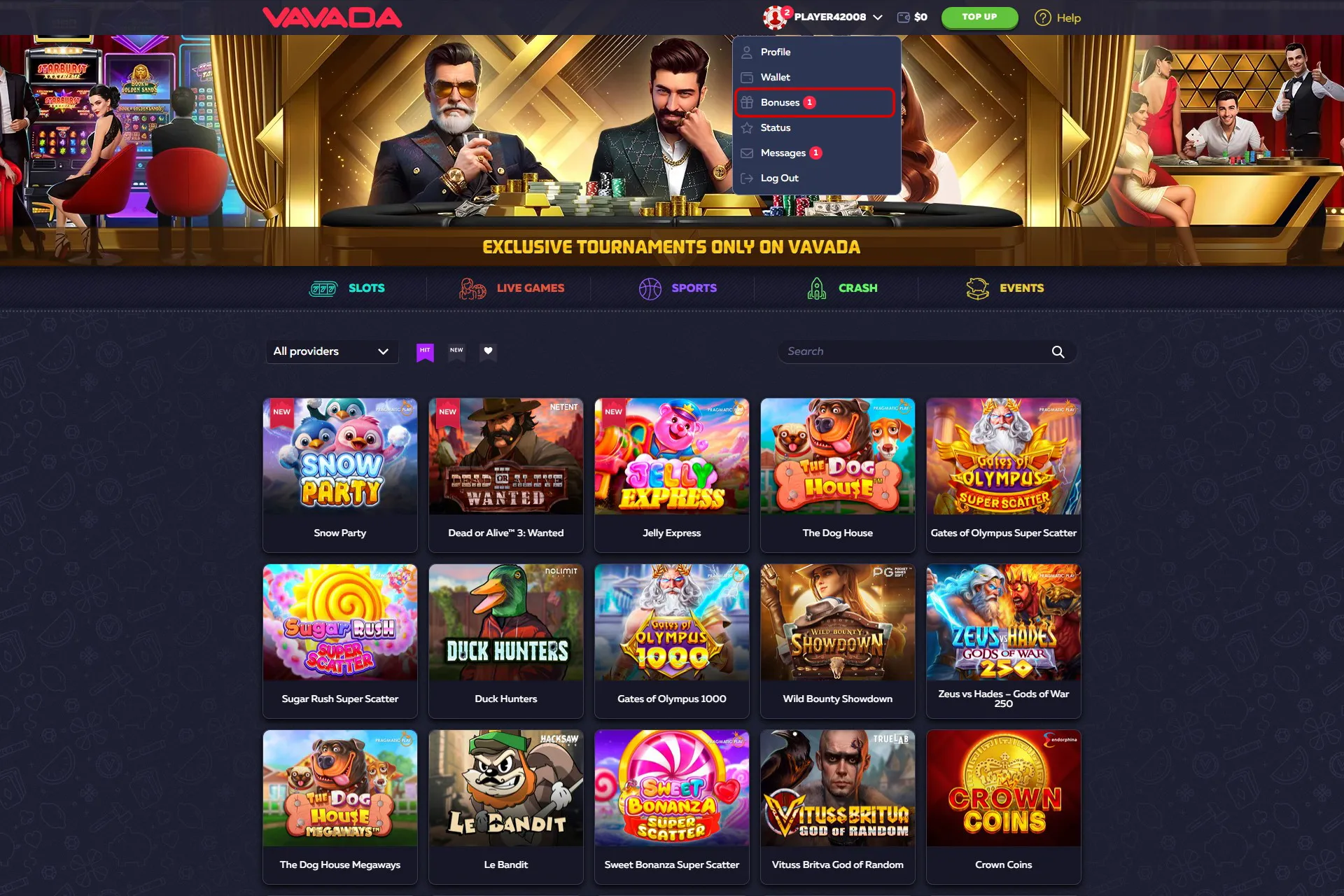 Vavadada turnirlar o'yinchi statusiga bog'langan. Faolliklarning bir qismi allaqachon Newcomer statusidan boshlab mavjud, boshqalari esa faqat Silver va undan yuqori uchun ochiladi. Turnirlar tizimi barcha akkauntlar uchun bir xil emas - mavjud musobaqalar to'plami profil darajasiga bog'liq.