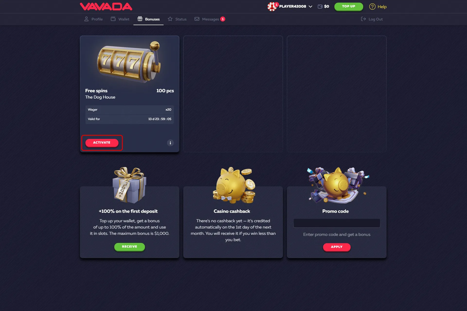 Formani yuborganingizdan so'ng profil mavjud bo'ladi, foydalanuvchi bonuslar va o'yin bo'limiga o'tishi mumkin.